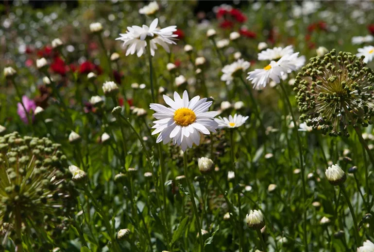 Natürlich gibt es auch den pflegeleichten Garten nicht ohne Stauden. Sie bringen Leben ins Beet. Für wenig Aufwand greift man zu einigen ausgewählten Sorten und pflanzt jeweils mindestens drei Individuen. Unterschiedliche Höhen beachten und gute Farbkombinationen wählen und schon kann der Sommer auch für den Hobbygärtner mit begrenzter Freizeit kommen. Robuste Pflanzen sind gefragt. Allen voran Frauenmantel und Wolfsmilch. Für den Frühling empfehlen sich dann das dicht wachsende Blaukissen, die hohen Lupinen, der farbenprächtige Nelkenwurz und viele attraktive Lilienarten; für den Sommer die rustikale Stockrose, die exotische Gladiole, das zarte Schleierkraut und die strahlende Sonnenbraut. Zum Schluss all die wunderschönen Dahlien und Astern, die den Herbst einläuten.